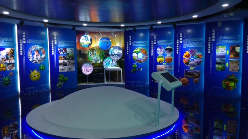 通過該展品,觀眾可從宇宙的視角來觀察自己所賴以生存的世界,了解地球的外界環(huán)境結(jié)構(gòu)及其來之不易的生態(tài)平衡;想象人類過分活動排放的過多溫室氣體對我們美麗的星球所引起的失衡后后果。 一具緩緩轉(zhuǎn)動的精美的虛擬地球儀,連綿不絕的云霧圍繞在它的周圍,襯托出我們?nèi)祟惿嫫胶獾氖澜纭2捎脝闻_投影將畫面投射在球形內(nèi)表面,通過圖像處理系統(tǒng)幻化成連綿不絕的云霧所圍繞的地球,展示出我們?nèi)祟惿嫫胶獾氖澜纭?套 1