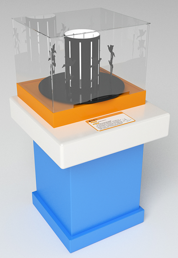 功能概述:展項由轉盤驅動機構和心跳干涉圖案組合構成,按下啟動按鈕,電機驅動光柵轉動,可看到莫爾條紋引起的視錯覺。