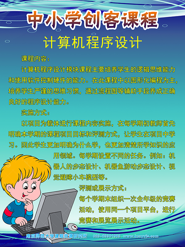 課程內容:計算機程序設計模塊課程主要培養學生的邏輯思維能力和使用軟件控制硬件的能力。