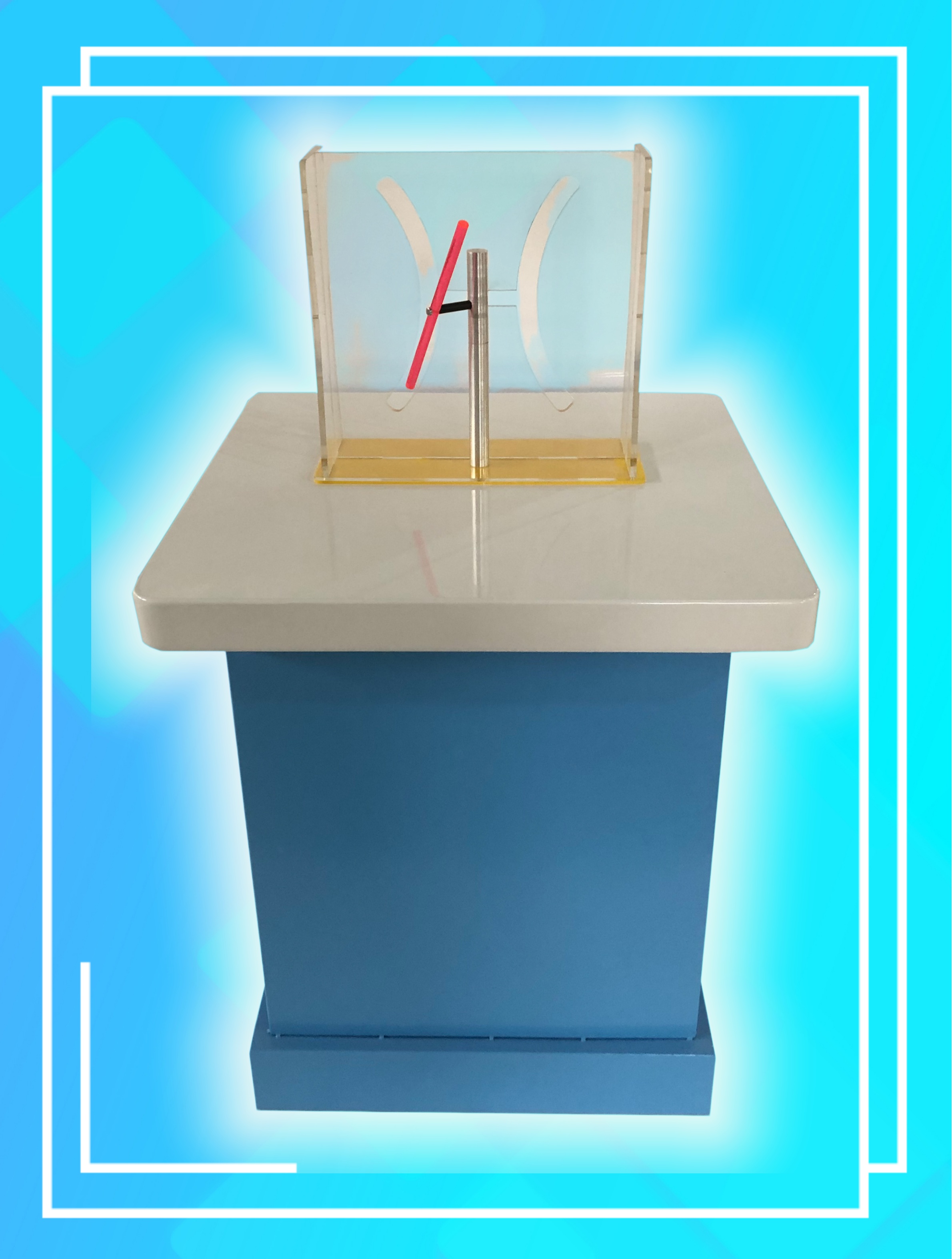 三、功能概述:展品由豎直管道和與它相聯的水平U型管、一個質量很輕的小球和風機組成。按下按鈕,啟動風機,就會看到沿氣流運動的小球到U型管上端口時很“聽話”的改變了豎直向上的運動方向,進入水平管道。為什么小球會如此聽話呢?根據伯努利原理:流體流速越大,壓強越小;流速越小,壓強越大。風機啟動時,豎直向上的氣流將管內小球托起,并沿氣流中心向上運動。豎直的氣流使得U型管內產生負壓,下端口壓強最小,當小球運動到U行管上端口時,在負壓的作用下,很“聽話”的改變豎直向上的運動方向,被吸入水平管道并向下端口處運動。在日常生活中,飛機上天的升力作用、足球運動中的香蕉球、乒乓球運動中的回旋球等都是伯努利原理的應用。伯努利原理的發現,對人類認識流體的特征和規律具有十分重要的意義。