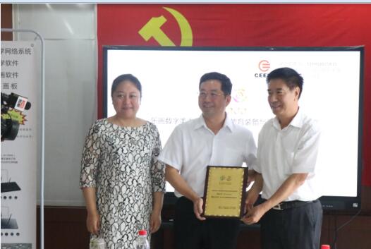 中國教育裝備行業協會王富會長與康智達公司貢慶慶總經理為四川優之原王益董事長頒發課題合作伙伴授牌