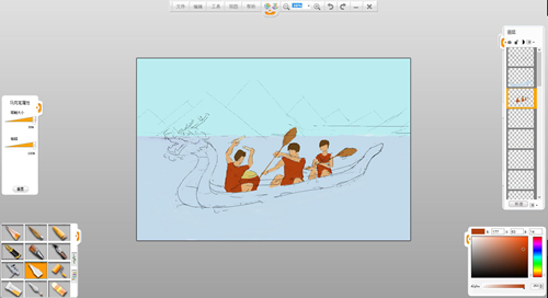 20.用馬克筆筆觸選取淡黃色(偏白),涂在龍舟和人物的受光面上,然后用刮刀筆觸涂抹均勻。