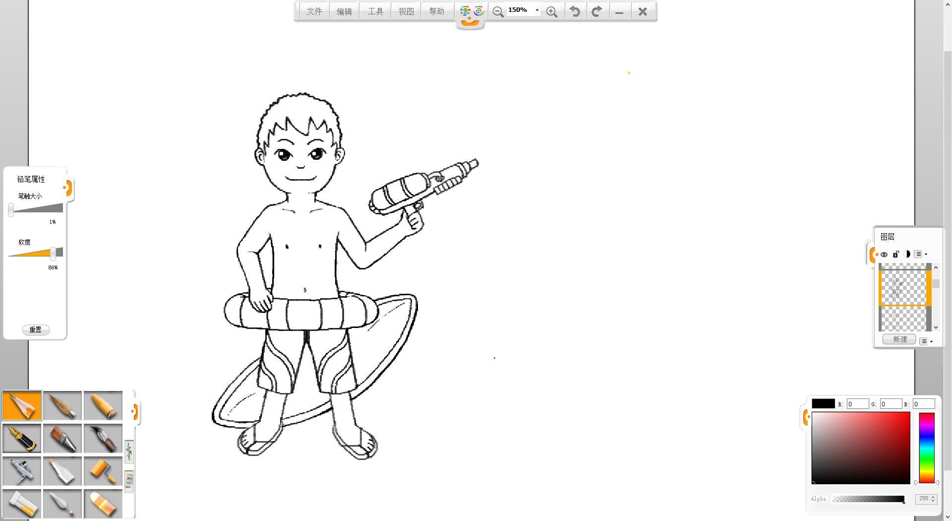 4.使用鉛筆筆觸繪制一個拿水槍的泳裝男孩形象。