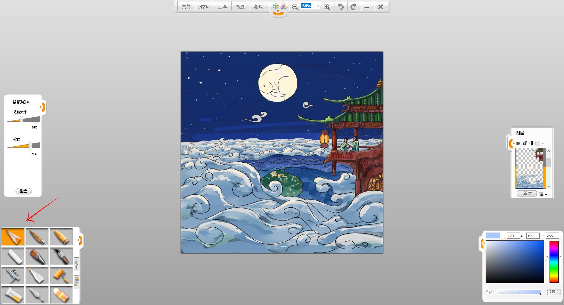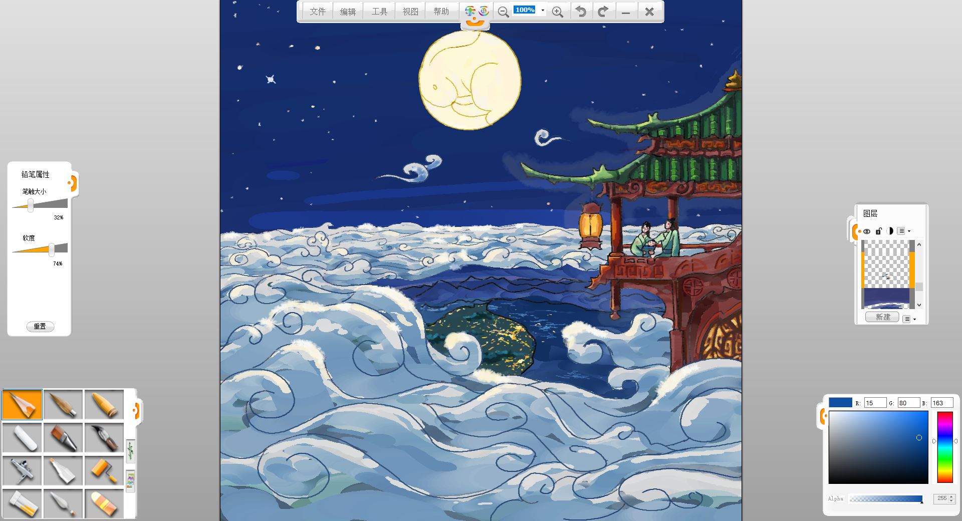 19. 最后潤(rùn)色調(diào)整些細(xì)節(jié),擦掉一些邊邊角角沒畫好的,這樣一幅中秋瓊宇賞月圖就完成了。