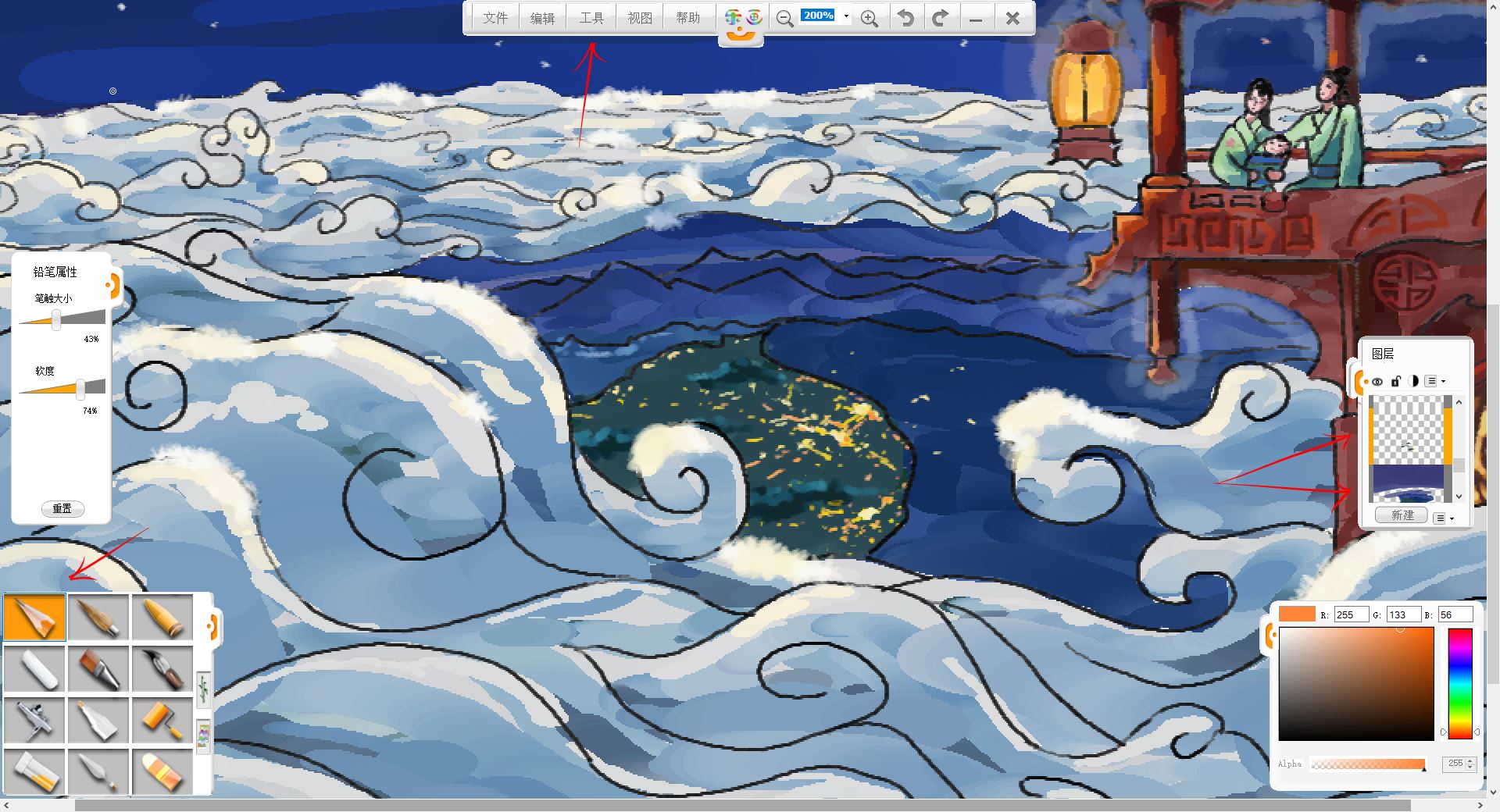 12.用“工具”-“調(diào)整”-“色相/飽和度”調(diào)整工具,調(diào)整云暗面圖層的色相,使其更符合環(huán)境色。然后合并樓宇,人物圖層,使用鉛筆工具,刻畫建筑圖案和陰影等細(xì)節(jié),對(duì)著月亮和燈籠的一面偏亮,背著的一面偏暗,線稿也可以稍作調(diào)整。