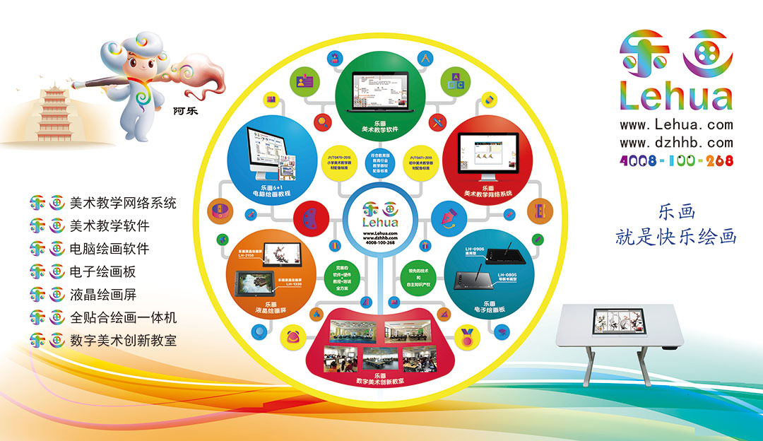 美術教學網絡系統、美術教學軟件、電子繪畫板、影像資料。3D打印機,3D樂畫筆。樂畫數字媒體創新實驗室以及樂畫藝術館整體方案