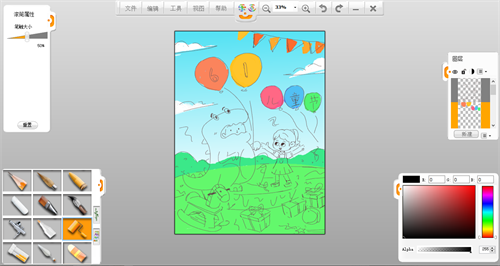 第五步:鋪墊背景色。這一步可以忽略細(xì)節(jié),確定畫面的整體顏色就可以。新建一個(gè)圖層放在草稿下方,在上方菜單里找到“工具-漸變工具”,繪制天空的的顏色;在左下方畫筆工具里選擇“滾筒”筆觸,大面積涂刷繪制草地;選擇“粉筆”筆觸給氣球、彩旗、云朵上色。