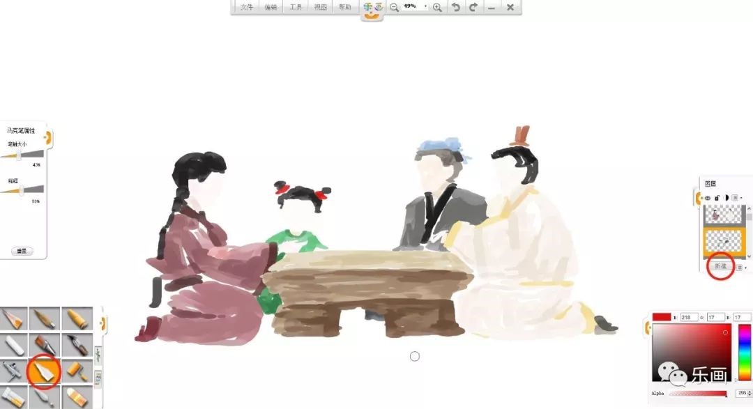 仔細觀察,因為圖層是透明的,所以石桌圖層沒畫東西的部分完全不會擋到人物。而已經繪制石桌的部分,擋住了妻子的衣袖,大家可以自己調整這兩個圖層的順序體會一下。