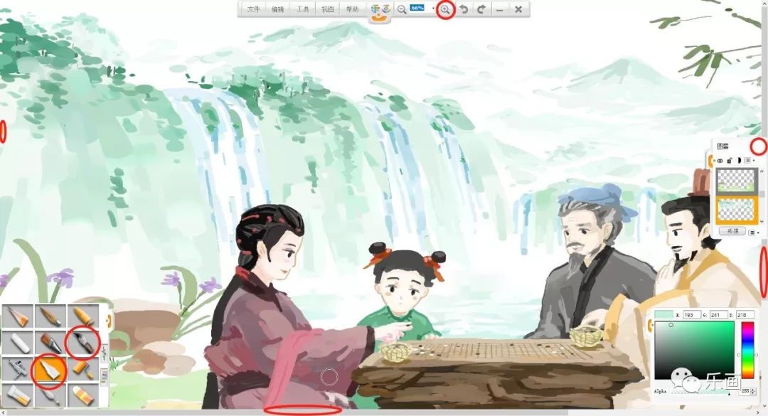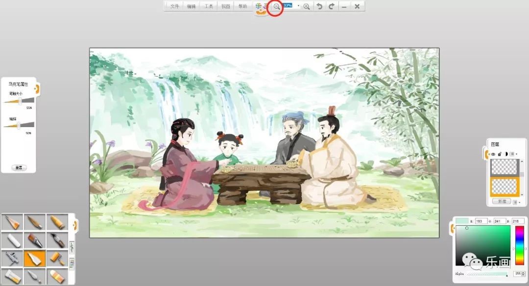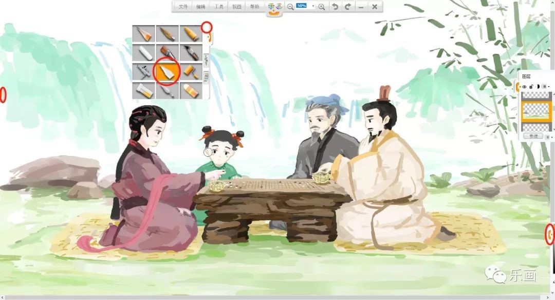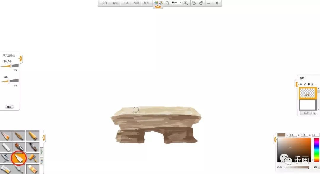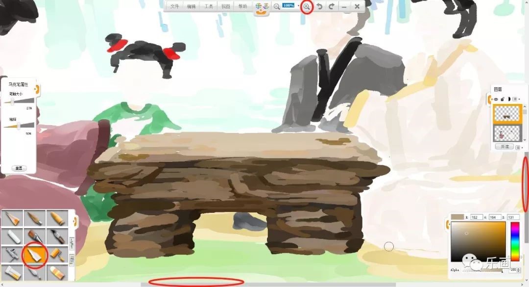 首先使用畫面上方的工具欄中的放大工具,將圖像放大,然后拖動下方滑塊和右側滑塊(也可以嘗試使用樂畫電子繪畫板面板左側四個快捷鍵中的“抓手”按鍵,使用繪畫筆的筆尖或鼠標拖動畫布圖像)。找到石桌位置,使其相對處于畫面中央,然后點擊石桌圖層,使用馬克筆筆觸細化石桌,刻畫圍棋石桌的紋理和質感。