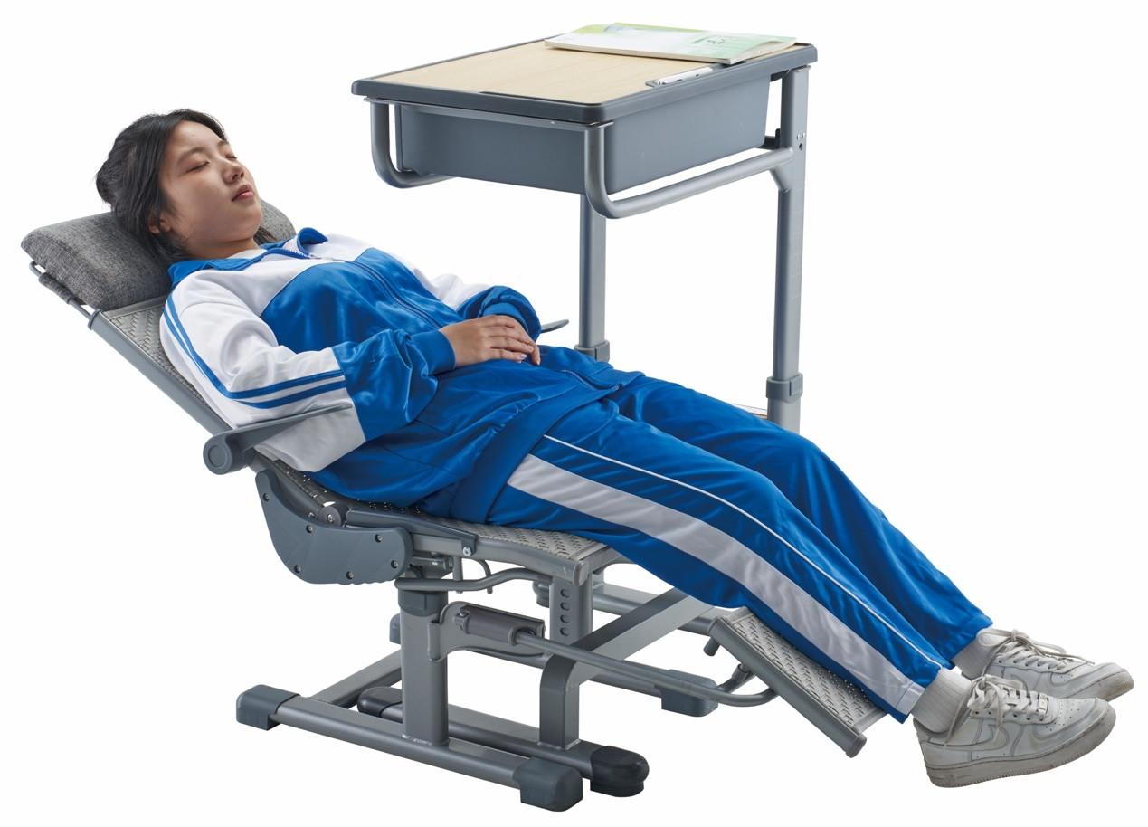 產品在研發時充分考慮到教室空間的利用率,將課椅椅腳進行延長保證穩固性,午休時將課椅向前移動,將桌面搖高到午休高度,充分利用課桌下方的可用空間和前位椅下的空間,并且讓平躺午休更加舒適安全。
