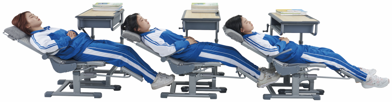 產品在教室內擺放時,小學生可在90公分前后間距實現150度原位舒適躺休,中學生可以在1米前后間距實現150度原位舒適午休。而且從座椅轉換成躺椅形態時,也不需要向外擴展空間,滿足多人教室和小面積教室的現實改造。