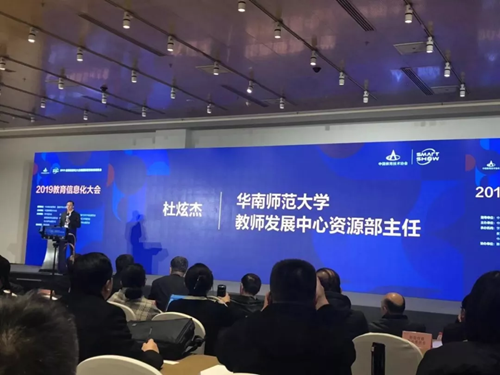 會上,黃榮懷教授、楊曉健副會長等專家學者都上臺進行了教育信息化發展的報告。華南師范大學教師發展中心資源部主任杜炫杰博士分享了《校園學習空間建設與應用案例》。