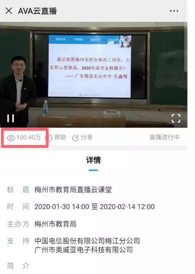 2月2日,為滿足高三學生的備考需要,廣東梅州市教育局組織開展“名師備考輔導網(wǎng)絡(luò)直播活動”,通過奧威亞的錄播設(shè)備及“名師直播支持服務(wù)”,向全市高三學生直播。一天內(nèi),東山中學共直播四節(jié)課,涵蓋語文、數(shù)學、英語、物理。上午2節(jié)直播課結(jié)束之前,短短4小時內(nèi)觀課人次就已突破100萬,觀眾點贊達11萬。
