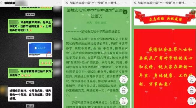 圖為:鄒城市實驗中學校方發(fā)布的網(wǎng)絡(luò)課堂紀實