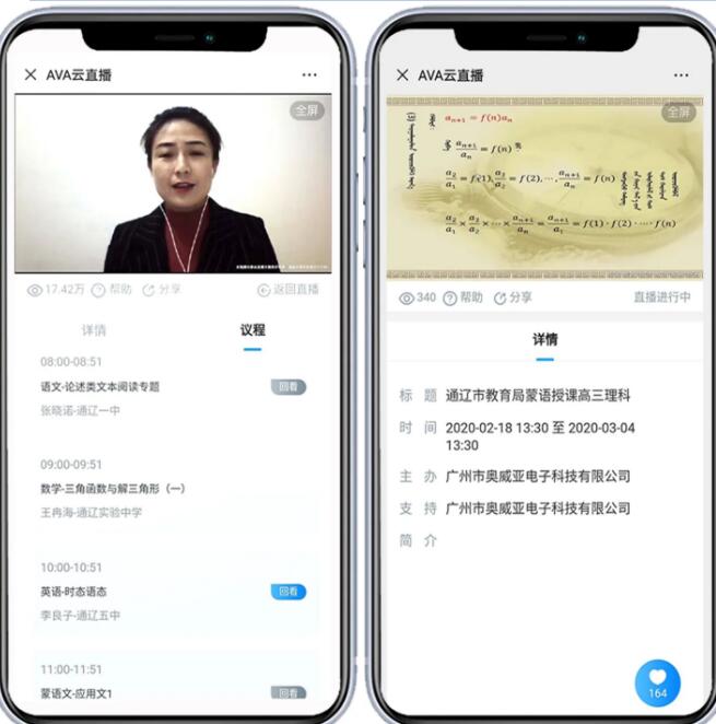 2月6日,阿拉善盟第一中學在奧威亞錄播教室和移動錄播設備支撐下,順利組織高三學子開展“空中課堂”,這也是內蒙古自治區第一個實施疫情期間“停課不停教、不停學”的學校。通過奧威亞云直播技術,學生只需在家通過手機、平板、電腦等便攜方式即可進行聽課,真正實現在“師生不聚集”前提下,開展教學活動。