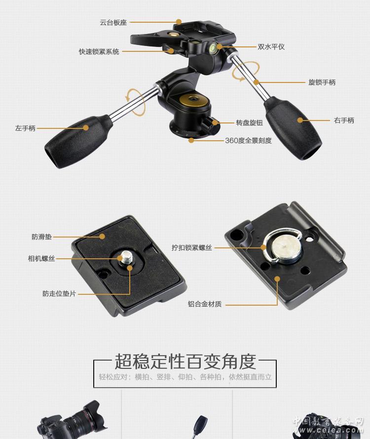 產(chǎn)品詳細(xì)介紹 維特利38H是一款雙手柄式三維云臺,能同時(shí)左右手并用,標(biāo)準(zhǔn)3/8英寸螺孔,適合與任何一款專業(yè)三腳架配搭;采用鋁合金材質(zhì),堅(jiān)固耐用;添加阻尼油,在攝像過程中得到很好的緩沖效果,手感舒適恰當(dāng); 帶有全景刻度轉(zhuǎn)盤,可實(shí)現(xiàn)360°水平全景接片拍攝;萬向角度的三腳架云臺,帶來全新的攝影攝像體驗(yàn),特殊研發(fā)的鎖緊結(jié)構(gòu),能比市面上多數(shù)云臺操作時(shí)間節(jié)省一半,一撥即可彈出相機(jī)變換手捧模式,一按即可連接三腳架主體,非常適合商業(yè)攝影師使用; 我廠承接三腳架云臺OEM貼牌代工,一件代發(fā),小額批發(fā)等,歡迎咨詢!
