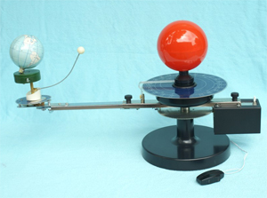 4、日食和月食: 演示時,使月球處于地球和太陽之間,再調整月球軌道圈,使月、地、日三者成一直線,月球的影子投射在球上,便發生日食。如地球處于月球與太陽中間,月球進入地形,便產生月食。