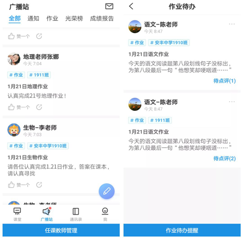 針對師生們無法面對面上課的情況,學校通過希沃云課堂、班級優化大師平臺,布置作業、批改作業、監督完成情況、表揚優秀學生、提醒落后學生、發布疫情通知,統計疫情情況。