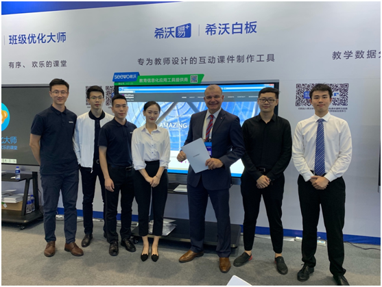 Martellacci在希沃展區(qū)現場觀看完工作人員的展示后稱贊到,并主動與產品和工作人員合影。
