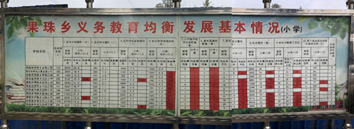 周末在果珠鄉中心校和老師們磨課,看見校園里的宣傳欄有這樣一張表格——“果珠鄉義務教育均衡發展基本情況”�;叵肫疬@幾天在鄉里看到的“控輟保學”標語,讓我第一次認真地去思考教育均衡這個命題。