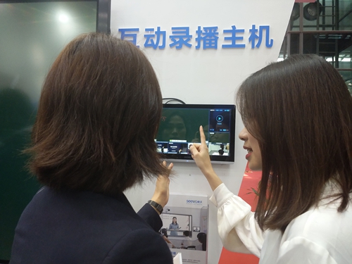 在希沃互動錄播前,一位女士與希沃工作人員興致勃勃地交談著,原來是想詳細了解希沃互動錄播是如何打造易應用、易普及的常態化錄播課室。希沃工作人員熱情回答:希沃互動錄播,為教學提供了簡潔易用的本地錄播、跨地互動、資源共享、教研評價等功能,幫助學校實現優質教學資源的開發和普及,讓師生的跨時空資源共享更簡單,教師不再需要勞師動眾就可以自行錄播,實現常態化使用。