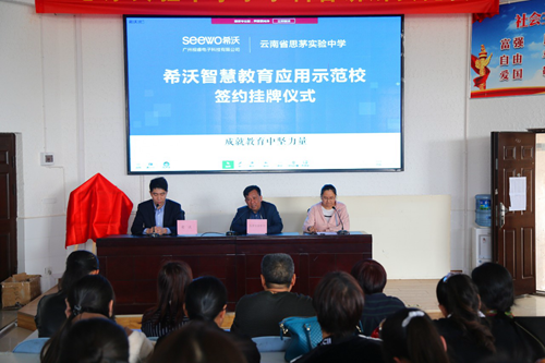 下午,希沃智慧教育應用示范校揭牌儀式在報告廳舉行,思茅實驗中學許副校長、希沃學務事業部邱澈總經理及希沃代表,與思茅實驗中學初一年級全體教師共同出席了儀式。