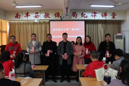 交流會上,南豐縣教體局為此次大賽榮獲一等獎、二等獎的優秀教師進行頒獎,小學萬志紅、黃曦老師及中學江文華、洪劍玲老師在會上作經驗交流分享,對此次培訓的希沃白板5、班級優化大師、移動授課助手等教學工具對教學帶來的幫助表示感謝,期望能有更多的機會參與信息化教學能力提升的活動,期望能與更多的老師一起成長。