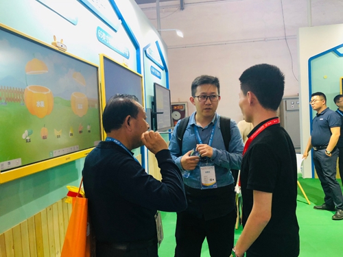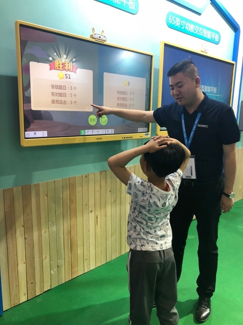 此次希沃與康普達聯合打造的兒童未來4D教室也頗為吸睛,許多小朋友體驗后不肯離開希沃展位,也引得現場不少“老小孩”大玩“變臉”等體驗互動體感益智游戲。