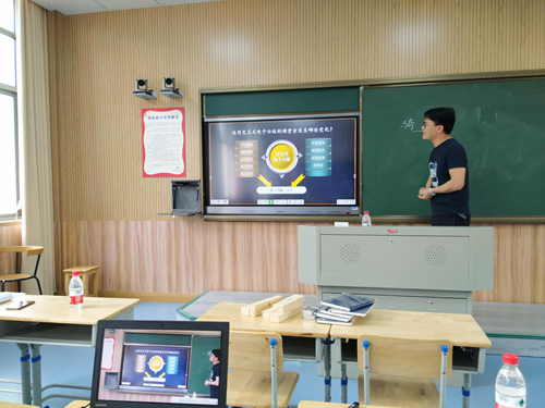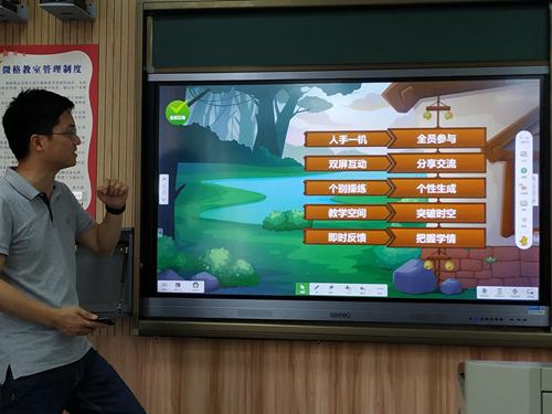 之后四場專家講座,王琦峰和陳科軍兩位老師就在語文課堂和數學課堂上交互式課件的運用與制作做了專題講座。介紹了在交互式課件中的各類技術應用。林森老師以“信息技術推進課堂教學變革”開場講了以北師大易課堂為例的學生互動式白板的實踐應用,并讓老師們體驗了希沃平板的使用。楊開遠老師通過
