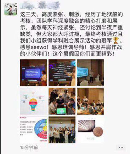 在為期三天的培訓中,老師們通過信息化教學提升系列課程的學習、小組研討、課程講解實操、學科融合案例展示、信息化教學講解考核等豐富的培訓環節,不斷加強自身的信息化教學素養。在和希沃金牌講師團、其他優秀教師的探討、交流、合作的過程中,也不斷加深對教育信息化與教育教學融合創新的理解。