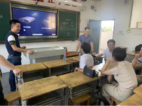 針對領導提出的問題,希沃專遞課堂負責人做出了解釋:“針對收音不均勻的問題,我們設計了掛在教室中間的全向麥克風,同時,我們的‘一師一麥’的方案,讓教師通過一個無線耳戴式麥克風直接連接音響收音,也能更好解決收音不均勻的問題。”