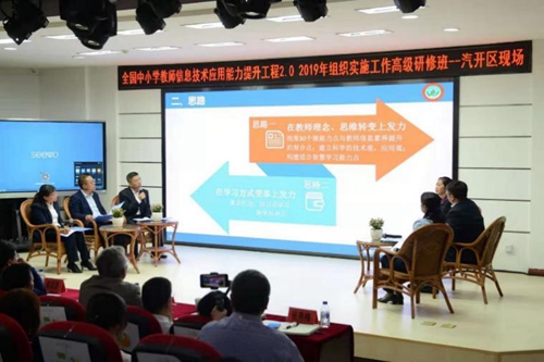 在汽開區(qū)進(jìn)修學(xué)校趙越副校長的主持下,校長團隊展示了“聚焦整校推進(jìn)尋求破解之道”主題論壇。第九中學(xué)李旦峰校長分享了立足于頂層設(shè)計,破解了2.0提升工程與學(xué)校整體規(guī)劃如何有機結(jié)合的問題;第七小學(xué)鐘梅校長、第十二小學(xué)王安巍校長分別從研修模式重構(gòu)、研修方式重塑兩個維度談如何將2.0提升工程工程的實施與校本研修融合為一體的思考與策略;實驗學(xué)校周國兵校長、第一中學(xué)尤君志校長分享了基于學(xué)校教師隊伍年齡偏大,如何破解老教師參與到2.0提升工程與技術(shù)應(yīng)用的問題。其中均提到希沃對于學(xué)校信息化建設(shè)。