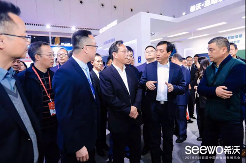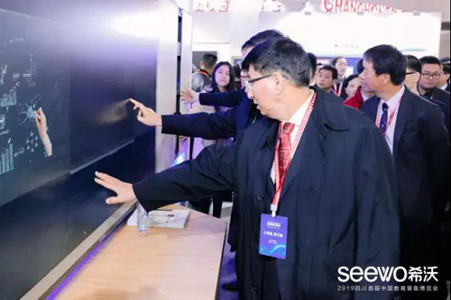 現(xiàn)場(chǎng),中國(guó)教育裝備行業(yè)協(xié)會(huì)會(huì)長(zhǎng)、四川省教育廳廳長(zhǎng)、四川省教育廳副廳長(zhǎng)等領(lǐng)導(dǎo)來到希沃展位進(jìn)行巡視。從希沃易課堂智慧課堂解決方案,到基于希沃交互智能錄播搭建的專遞課堂,再到研討型智慧教室及數(shù)據(jù)駕駛艙,場(chǎng)景多樣、技術(shù)創(chuàng)新的希沃展區(qū)令眾領(lǐng)導(dǎo)不時(shí)駐足觀摩并上手體驗(yàn)。