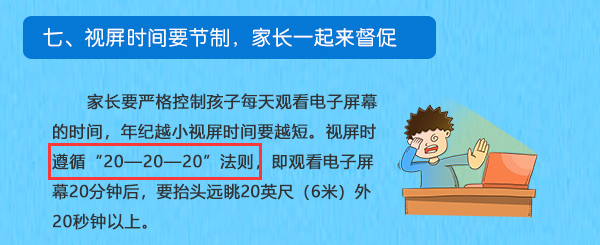 家長(zhǎng)一起來(lái)督促”,要求孩子在觀看電子屏幕20分鐘后,家長(zhǎng)督促其抬頭遠(yuǎn)眺20英尺(6米)外20秒鐘以上。