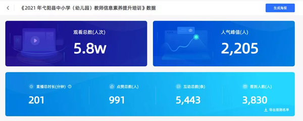 8月24日線上培訓正式開始,培訓第一階段為線上直播課,課程涵蓋了希沃白板交互式課件制作、班級優化大師智能班級管理、新型微課知識膠囊制作三部分內容,旨在使老師們掌握互動課件制作、班級管理軟件應用以及微課錄制的方法,從而提升教師信息化素養。線上直播課觀看人次累計5.8w,互動次數達5543次,同時在線老師人數高達2205人。直播效果顯著,真正將“足不出戶就能享受教育培訓資源”落實到位。