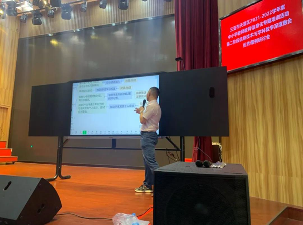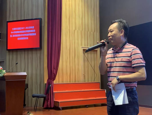 天涯區(qū)教育局教研室主任楊得伸上臺發(fā)表講話:“當(dāng)前,教育信息化已經(jīng)步入加快推進的黃金時期,也進入升級發(fā)展的關(guān)鍵期。我區(qū)堅持‘以信息技術(shù)與教育教學(xué)深度融合推動教育理念變革、模式再造、體系重構(gòu)、機制創(chuàng)新’核心理念,聚焦‘智慧教育示范區(qū)’建設(shè)目標(biāo),聚力實施‘天涯區(qū)智慧教育建設(shè)行動’。在剛結(jié)束的線上學(xué)習(xí)中,我區(qū)共計886人通過培訓(xùn),整體培訓(xùn)通過率達(dá)到87%,其中16人被評為優(yōu)秀學(xué)員;在此我對以上老師表示衷心的祝賀。今天我們邀請到海口北師大、華二黃流中學(xué)、北京外國語附屬的三名教師給我做公開課分享交流活動。希望老師們有所成長、有所收獲。最后,要再次感謝希沃在本次活動中的大力支持。”