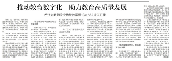 助力教育高質(zhì)量發(fā)展》為主題,報(bào)道了濮陽市實(shí)驗(yàn)小學(xué)智慧校園建設(shè)應(yīng)用情況。學(xué)校的信息技術(shù)教育實(shí)踐是各地加快信息化建設(shè)、推動信息技術(shù)與教育教學(xué)融合創(chuàng)新發(fā)展的一個縮影。