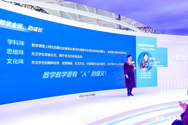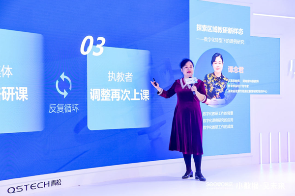 展會上,一場交流會吸引了現場眾多觀眾的駐足圍觀,教育部國培計劃專家、湖南省湘潭市雨湖區教育研究培訓中心數學教研員譚念君,以“探索區域教研新樣態——數字化轉型下的課例研究”為題,向觀眾分享了數字化教研經驗,共同研討數字化教育的新發展。
