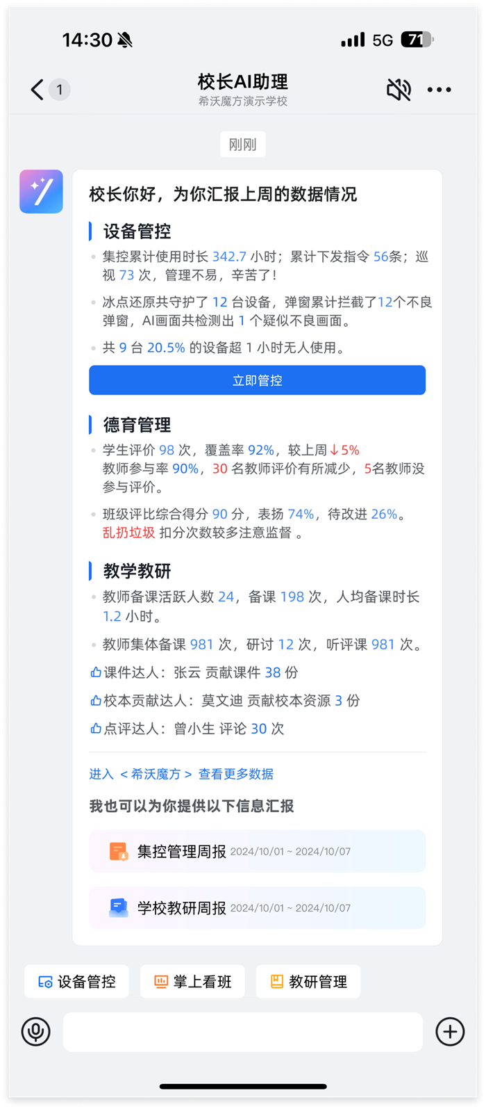 希沃魔方與釘釘教育將全面打通基座,為K12提供全鏈路數據協同方案,并通過數據大屏和管理者駕駛艙提升校園決策的科學性。釘釘既有的局-校-班-家互聯優勢,融合希沃魔方的教學教研、設備管理和德育評價方案,將倍數級放大應用的功能效果和用戶體驗。未來,雙方還將依托釘釘在大模型領域的先發優勢與強大的AI開放生態,結合希沃魔方軟硬一體設備及長期積累的教學內容優勢,構建智能教學新生態。 目前,雙方已經實現產品場景融合方案的初步落地,為校方管理者、一線教職工提供1+1>2的智慧教育體驗。校長主任無需多設備App來回切換,只需通過釘釘“AI助理”一個入口,即可獲取專屬教研、評價與管理數據變化周報,輔助校園動態決策。信息化管理員無需現場巡查、手動統計,即可通過可視化報表,隨時了解交互智能平板等設備使用與達標情況,篩查設備異常狀態。對于一線教師來說,集成后的新系統大大簡化了繁瑣、零碎的教學事務,老師可直接通過釘釘側邊欄,一站式訪問白板課件資源,完成集體備課、聽評課等日常教學操作,實現教學資源共研共享。