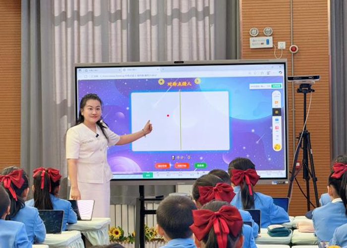 課例一:《軸對稱》(執教者:銀川市金鳳區第十一小學-姚佳):以傳統文化剪紙為切入點,借助DeepSeek工具開發的“對稱點獵人”動態交互程序,引導學生直觀探究并驗證“對稱點到對稱軸距離相等”及“對稱點連線垂直于對稱軸”的核心性質,借助希沃智慧課堂學生終端的AI圖像創作功能,加強學生對知識的理解,做到學以致用。有效化解傳統教學中空間想象的抽象難點。