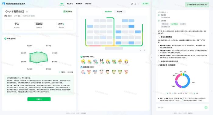 不論教師評課還是教學反思,它讓復盤告別主觀印象,系統記錄的互動細節成為“證據鏈”,教師借此精準定位教學亮點與盲區,實現靶向改進,評課也不再是泛泛而談,而是有據可依。對教師個體而言,它像一位隱形導師,基于課堂行為數據提供專屬改進建議,讓新手教師快速站穩講臺,骨干教師突破能力瓶頸,讓不同階段的成長需求皆有回應。