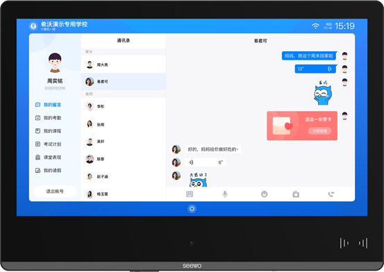 手機(jī)禁入校園后,家長最擔(dān)心的就是無法及時與學(xué)生建立聯(lián)系,不了解孩子的在校情況。希沃云班牌的NFC刷卡識別和人臉識別功能,讓學(xué)生以刷卡或刷臉的方式快速登錄個人賬號,通過班牌實(shí)時向家長發(fā)送留言,留言形式豐富,包括文字、語音、表情包等。家長也可以通過手機(jī)直接發(fā)送留言給孩子,孩子可以在課間刷卡閱讀和回復(fù)。
