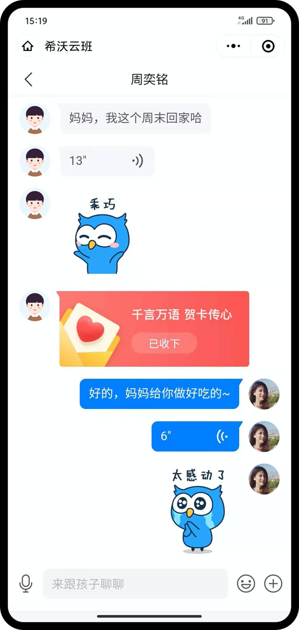 遇到特殊節(jié)日,學(xué)生可以向家長發(fā)送賀卡,表達(dá)自己的節(jié)日祝福和感恩。賀卡以留言的方式推送,多樣的留言形式讓文字充滿溫度,讓溝通更能傳遞情感。