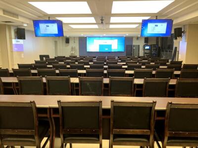 位于15層的職工大會議室面積超200平方米,可容納120個參會人員。itc根據中心的建設需求,建設了專業擴聲系統,參考國家廳堂擴聲設計標準一級進行設計,根據區內的情況設計專業主音箱,保證每個空間的聲場聽覺均勻。搭配智能音頻數字系統,提供多種專業模式供客戶使用,實現將功能最大化。