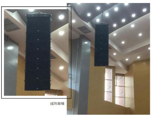 主線陣音箱的設計,采用全頻音箱+低頻音箱組合吊裝,根據會場的實際長度調整每只全頻音箱音域的輻射角度,確保覆蓋無死角。