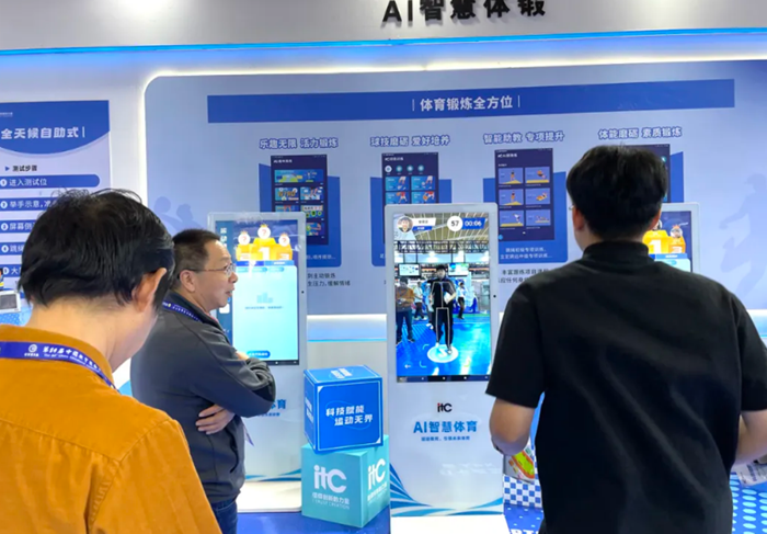 展會期間,itc特設AI智慧體育打卡專區,現場觀眾可以近距離體驗AI智慧測試、AI智慧體鍛、AI智慧教學等itcAI智慧體育系統核心功能,觀眾參觀體驗集章打卡即可獲得精美禮品。AI智慧測試,通過AI攝像頭捕捉現場體驗者運動過程,實現運動成績識別、違規動作識別、運動過程分析等功能,參加者無需穿戴設備,通過人臉識別,舉手即可開始測試。AI智慧體鍛,AI自動視頻采集識別體育鍛煉數據,集玩耍與鍛煉于一體,寓教于樂。