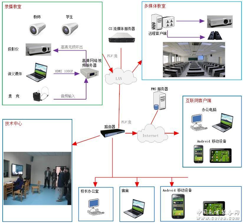 系統(tǒng)基于校園網(wǎng),并擴展至互聯(lián)網(wǎng)應(yīng)用,可以實現(xiàn)校園網(wǎng)上任何一間多媒體教室內(nèi)教學的錄制和直
