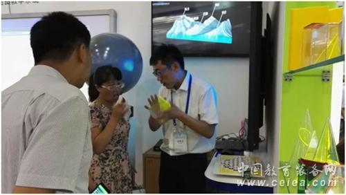 上圖:中教股份教學(xué)服務(wù)中心講師講解展示數(shù)學(xué)實(shí)驗(yàn)室產(chǎn)品