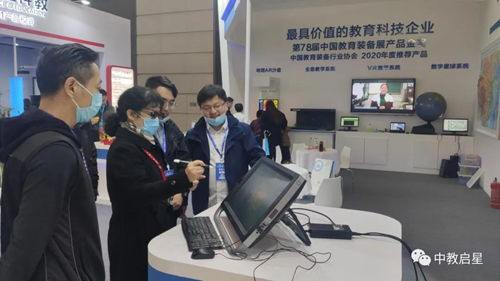 中教啟星核心產品在1號館066號展臺實力吸睛,中行協金獎產品寰宇地理VR教學系統、文明的足跡VR教學系統,以及中行協推薦產品數字星球系統、交互教學系統、AR沙盤教學系統均吸引了不少觀眾停下腳步體驗。陜西省教育廳教育技術裝備管理中心主任趙夢也來到中教啟星展位體驗VR教學系統。