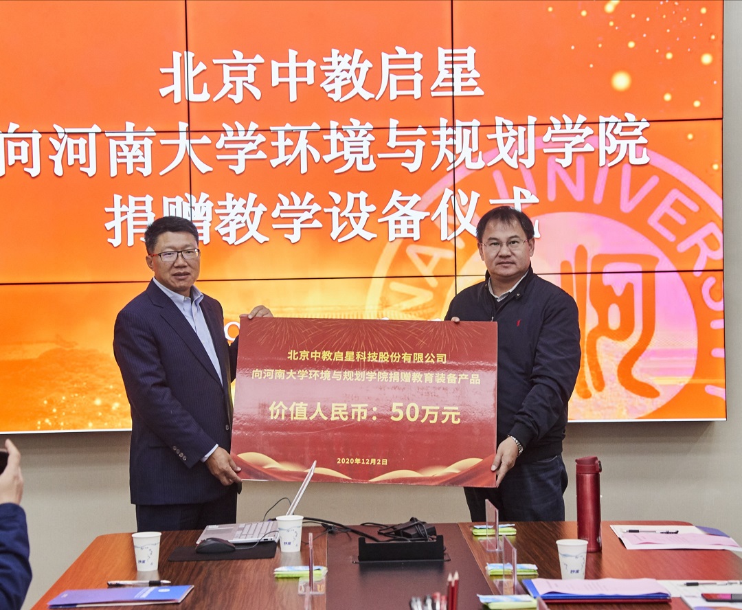 中教啟星總裁王天祥捐贈(zèng),環(huán)境與規(guī)劃學(xué)院黨委書(shū)記鄭洪濤代表學(xué)院接受捐贈(zèng)